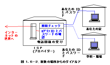 このことを逆に考えるとプロバイダーとしては、IDとパスワードが正しければ、どの電話から接続しようと、どのパソコンから接続しようと、インターネットに接続することになります。例えば図1-6.2のようにあなたの家でも学校・職場からでもプロバイダーに接続することができます。