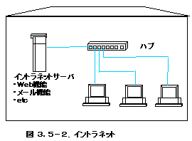 イントラネットの場合でも、内部のパソコンからインターネット上のホームページ等を見たいものです。そんな場合、イントラネットとインターネットを接続した状態を図3.5-3に示しました。図3.5.1との違いは、中から外の情報はみたいが、外からは中のイントラネットサーバにはアクセスしてほしくないということです。