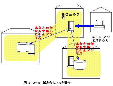 今まで説明してきたように、あなたのサーバに不正アクセスするだけでなく、そこからまた他人のサーバに不正アクセスすることを踏み台にするといいます(図3.9-5参照)。この場合、あなたは被害者であると同時に他の人にとって加害者となります。いちど踏み台にされると、その情報が不正アクセスの裏社会に流れ、どんどん踏み台にされるという状態もあります。