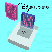 左の図にファミコンでのプログラムの変更方法をまとめてみました。ファミコンの場合、各カセットの中にメモリが入っていてそこにプログラムが格納されています。そして、カセット自体を変えることによりCPUが使うプログラムを変更していることになります。 |