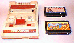 ファミコンは左の写真の示したように白と赤の本体と、ゲームごとのカセットで遊びます。実際に使う時は右の写真のようにカセットを本体に差し込んで使います。麻雀のカセットを差し込めば麻雀ができますし、将棋のカセットを差し込めば将棋ができます。 |