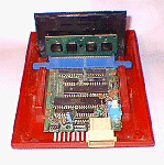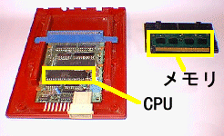 ファミコンもパソコンと同じようにコンピュータの一種です。そこでCPUとメモリがあります。左の写真はファミコンを分解したところです。本体にはCPUが入っています。またカセットの中にはメモリが入っています。このメモリの中にはそのカセットのゲームに対応したプログラムが設定されています。右の写真はCPUのある本体にメモリの入ったカセットを差し込んだところです。 |