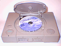 右の写真は本体にCDを入れたところです。プレイステーションもファミコンと同じように、本体に入れるCDによって遊べるゲームが変わってきます。ただし、CDの中にはファミコンのカセットのようにメモリが入っているわけではありません。プレイステーションもやはりコンピュータの一種ですからCPUとメモリがあるはずです。どうなっているのでしょうか。 |