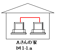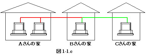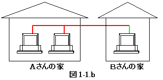 図1-1.bはAさんが電線みたいなものをBさんの家までひっぱって、AさんパソコンとBさんのパソコンをつないだところです。これで二つの家のパソコンのデータが相互に使えたり、また、パソコンを使ってAさんとBさんは伝言を伝えることもできます。