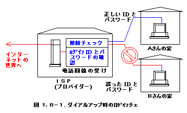 ダイアルアップを利用している人は気づくと思いますが、図1.6-1に示したように接続時にID(アイディー)とパスワードを指定します。これはプロバイダーが契約している人が接続しているか確認するためのものです。したがって誤ったIDやパスワードを指定するとプロバイダーの装置の方で接続を拒否します。