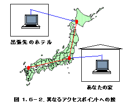 このことを逆に考えるとプロバイダーとしては、IDとパスワードが正しければ、どの電話から接続しようと、どのパソコンから接続しようと、インターネットに接続することになります。例えば図1-6.2のようにあなたの家でも学校・職場からでもプロバイダーに接続することができます。
