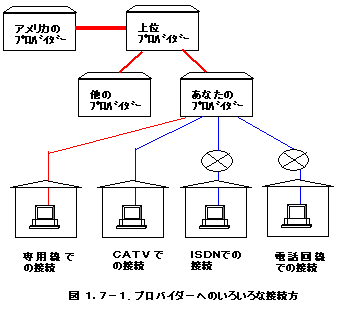 次にプロバイダーへの接続方法を説明します。図に示すように普通の電話回線で接続するのが一般的です。同様にISDN(アイ・エス・ディー、エヌ:Integrated Services Digital NetWork:意味は通信サービスを統合するデジタル通信網)というインターネットなどの通信適した回線もあります。最近ではCATV(シーエーティービイ−:CAble TeleVision:意味は有線テレビ)などからも接続できるようになりました。