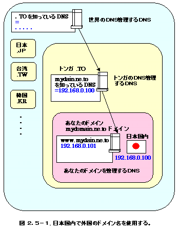 いうなればドメイン名とIPアドレスの対応がDNSサーバで定義されていればいいので、その極端な例を図2.5-1に示しました。トンガという国では、その国のドメイン名を外国の人に一定の料金で提供しています。あなたがもしこのトンガドメインを取得した場合、トンガの国のドメイン名を管理するDNSには、あなたのDNSサーバの情報とIPアドレス(日本国内に割り付けたものですが)を登録します。するとあなたのトンガ・ドメインへアクセスする人はまず、トンガのDNSサーバであなたのDNSサーバの情報を取得し、次に日本国内にあるあなたのDNSにアクセスします。(トンガのドメイン名を日本で使うことに違和感があるかもしれませんが、基本的に国別のトップレベルは国籍や所在地に関係無く、その国に役立つ場合にドメイン名をもらえるぐらいにもらえると考えた方がいいかもしれません)