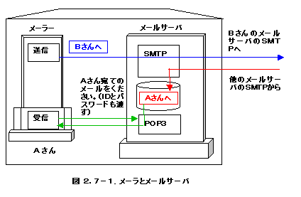 図2.7-1には電子メールの送受信の中でどのようなことが行われているか示しました。まず、メールの転送にはSMTP(エス・エム・ティー・ピー:Simple Mail Transfer
