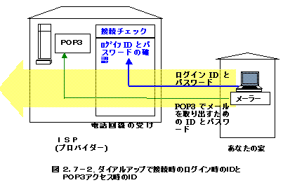 ここでPOP3のIDとパスワードがでてきたので、ダイアルアップの場合のID、パスワードとの関係を考えてみます。この両者はまったく無関係で、ダイアルアップのときのものは電話回線でつなくことを確認するためのものです。また、POP3のものは、メールの受信について確認するためのものです。多くのプロバイダーでは、このIDとパスワードを同じものを設定しているため、混同しやすいですが、本来、ダイアルアップとPOP3のIDとパスワードはまったく違ったものでもかまいません(もともと関係ないものですから)。