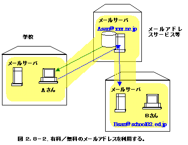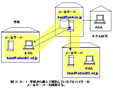多分皆さんの多くは、学校や教育センターのメールサーバやプロバイダー等、実際パソコンを利用してところから物理的にも近いメールサーバを利用していると思います。ところが、世界中のWebサーバからホームページが見れると同じように、メールサーバもインターネットのどこかのあれば、あなたはそれを利用することができます。例えば、図2.8-1に示したようにAさんは自宅からプロバイダーのメールサーバを普段使っていたとします。そしてAさんが学校に行き学校がインターネットにつながっていたならば、その学校からも自宅でアクセスしているプロバイダーのメールサーバを使って送信したりPOP3を使ってメールを受信することができます。