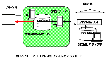 Webサーバが身近に無い場合はどうするのでしょうか。その時は図2.10-2のようにインターネットを使ってファイルを転送します。TCP/IPにはFTP(エフ・ティー・ピー:File Trensfer Protocol:意味としてはファイルを転送するプロトコル)がありこれを利用します。図のようにパソコン側ではFTP対応ソフトを使い、サーバ側ではFTPサーバを経由してWebサーバに格納します。プロバイダーのWebサーバ中にホームページを作る場合は、このFTPでHTMLファイルを転送する必要があり、このようにパソコンからサーバにファイルを転送することをアップロードといいます。