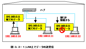 図3.3-1は192.168.0.10というパソコンから192.168.0.11というパソコンにデータを送ったところです。直接送れればいいんですが、あくまでLAN上は電気的な信号が同じように流れるので、実はLAN上のすべてのパソコンにそのデータが届いています。実際192.168.0.12のパソコンでは自分宛てのデータでないので無視しているだけです。