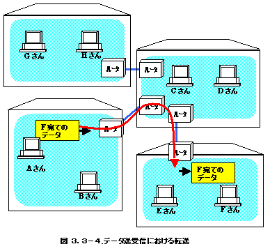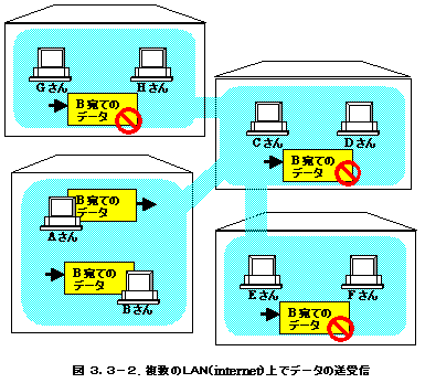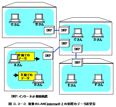 図3.3-2では複数のLANがつながったinternetの状態を示しました。この場合AさんがBさんにデータを送る場合でも、他のLANにつながっているすべてのパソコンにも同じデータが届くことになります。本当のインターネットの世界では、数十万台のパソコンが物理的につながっているため、もし、このようにある人のデータがすべての人に届くようだと、インターネットはすぐにパンクしてしまいます。