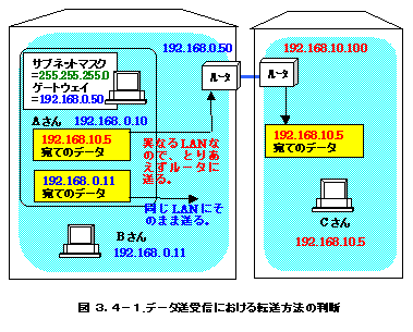図3.4-1に二つのネットワークをつないだ状態を示しました。実際にAさんがBさんとCさんにデータを送る場合を考えてみましょう。Aさんのパソコンには、データの送信方法を判断するためにサブネットマスクとゲートウェアの情報が設定されています。サブネットマスクは、これから送るデータがAさんの属しているネットワーク宛てのデータか判断するのに使用します。またゲートウェイはIPアドレスであり、これは、他のネットワークとつながっている、ここではルータのIPアドレスを指定します。