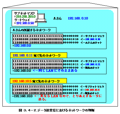 図3.4-2にサブネットマスクを使って自分の所属ネットワークかどうかの判断の仕方を示しました。サブネットマスクは、難しい表現になりますが、IPアドレスのうち所属ネットワークとしてどの番号までがいっしょか示しています。これは2進数で無いとかりにくいので、図ではそのような表現にしています。2進数など詳しくない人は判断のイメージをつかんでください。図のAさんの所属するネットワークアドレスのところで
