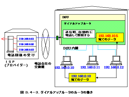 ここで新ためてダイアルアップルータの機能を図3.4-3に示しました。図の中で同じネットワークのパソコンにデータを送る場合は、特にダイアルアップは何も動作しません。とこが、外のネットワークへデータを送る場合等、今まで説明してきたように、パソコンはダイアルアップルータに対してデータを送ります。するとダイアルアップルータば自動的にプロバイダ等に電話をかけインターネットに接続してからデータを送ります。