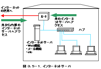 図3.5-1にインターネットサーバをインターネットに接続した状態を示しました。これは単純にネットワークに接続してルータ経由で外部のインターネットと接続します。(もちろんルータもハブに接続しています。)