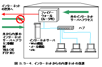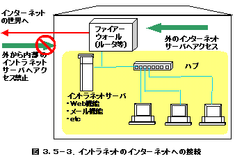イントラネットの場合でも、内部のパソコンからインターネット上のホームページ等を見たいものです。そんな場合、イントラネットとインターネットを接続した状態を図3.5-3に示しました。図3.5.1との違いは、中から外の情報はみたいが、外からは中のイントラネットサーバにはアクセスしてほしくないということです。