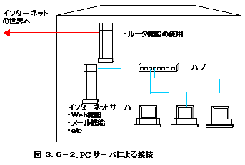 図3.6-2にはパソコンルータとして使った例を示しました。パソコンにルータの機能を持つプログラムを入れることにより、ルータとして動作させることができます。この場合ルータのパソコンには2枚のネットワークカードを入れて一つを外のインターネット、もう一つを内部のネットワークにつなぎます。またパソコンにファイアーウォール用のソフトを入れることで安全で高機能のファイアーウォールを構築することもできます。
