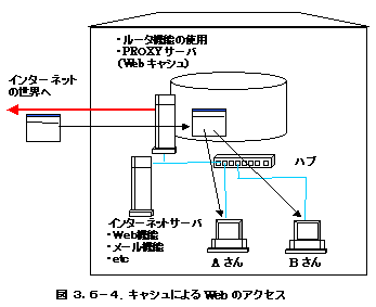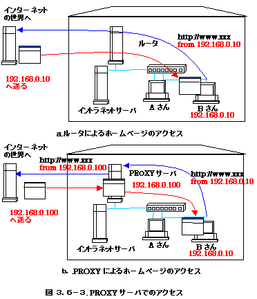図のa.はルータを使ってホームページをアクセスしているところです。Bさんからホームページをアクセスする場合、相手先のWebサーバは直接、そのホームページの内容を送ります。図のb.はプロキシ−サーバを使ったところです。この場合Bさんはこのサーバを経由してホームページをアクセスします。サーバではBさんからの要求がくると、そのホームページの相手先に対してサーバ自体からアクセスするようにします。相手先のサーバでは、プロキシーサーバからの要求なので、そこにホームページの内容を送ります。プロキシーサーバは受け取った内容をさらにBさんに戻します。