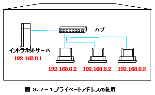図3.7-1は前に出てきたイントラネットです。このようなイントラネットの場合は、外部のインターネットにまったく接続していないため、自由にIPアドレスを使えることになります。但し、かってにIPアドレスを使っていると、このイントラネットをインターネットに接続した場合混乱がおきるので、現在のIPアドレスの体系では表3.7-1のように内部でクローズするようなネットワークの場合に使うIPアドレスの範囲を決めていて、これをプライベートアドレスと呼んでいます。