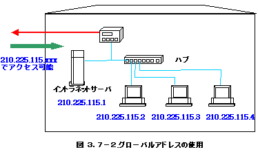図3.7-2は前に出てきたインターネットへつなぐ場合です。この時のIPアドレスはプロバイダーから割り付けられたアドレスを使用します。ブライベートアドレスに対して世界中で一意に決まるるようなIPアドレスのことをグローバルアドレスと呼んでいます。各パソコンにグローバルアドレスを割り付けている場合、パソコン自体インターネットの世界で直接認識されているといえます。(今までの説明で当然グローバルアドレスの値で表示しなければいけないところがありましたが、架空のIPアドレスを使いたかったためプライベートアドレスで表現してきたところがあります。)