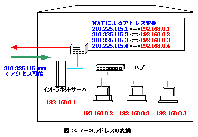 図3.7-3には、プライベートアドレスを使っているイントラネットをインターネットにつなげた状態を示しています。プライベートアドレスのままだと、インターネットの世界でどのパソコンかわからないため、ここではNAT(ナット:Network Address Translator:意味としてはネットワークのアドレスを変換するもの)を使用しています。NATではあらかじめ使用するグローバルアドレスとプライベートアドレスの対応を設定しておくことにより、例えば192.169.0.2のパソコンからインターネットにアクセスする場合は210.225.115.1のアドレスからアクセスするようにみえます。