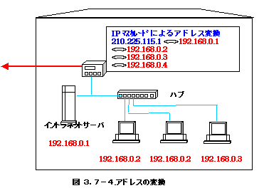 ダイアルアップルータの場合は、プロバイダからダイアルアップした時一つのIPアドレスしか割り付けられないのに、内部の複数のパソコンが同時に使用できるのは、このIPマスカレードの機能を使っています。