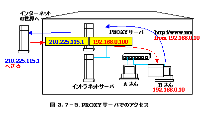 ここで説明してきたNATやIPマスカレードの機能は、主にルータ内に組み込まれています。また、図37-5のようにプロキシーサーバでもグローバルアドレスからのインターネットの世界へのアクセスが可能です。この場合PROXYサーバには、外用と内用のふたつのネットワークを接続するため、2枚のネットワークカードを持ち、それぞれグローバルアドレスとローカルアドレスを割り付けて使用します。いままではっきりとは説明しませんでしたが、ルータやファイアーウォール等のネットワークとネットワークをつなぐ装置はこのように、2つのネットワークの口があり、それぞれに橋渡しをしています。