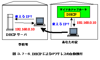 Configuration Protocol:意味としては各コンピュータの設定を自動的(動的)に決めるプロトコル)があります。図3.7-6にその役割を示しました。例えば、あなたがノートパソコンを持っていて、家でダイアルアップルータに接続し、学校ではLANにつないで使うとします。ほとんどの場合、それぞれのネットワークで使うIPアドレスの番号が違うため、あなたは、学校と家で使う場合、それぞれのTCP/IPの設定をし直すことになるでしょう。