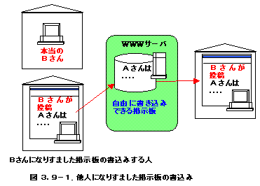 ネットワーク上である人のようにふるまって、データを発信することをなりすましといっています。図3.9-1には最も単純ななりすましを示しました。これは他人の名前をかたって掲示板等に中傷やその人に不利になるような情報を書き込んでいます。第三者がその内容を見ると、あたかも成りすまされた人が書き込んだようにしか見えません。なりすましにはもっと高度な技術を使う場合もありますが、この例のように単純だからこそシステムで防ぐのが難しく利用者のモラルにたよるしか無いという問題があります。