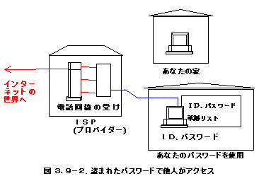 図.3.9-2ではあなたのパスワードが盗まれて他人に使われた状態を示しました。単に他人があなたになりすまして、アクセスするだけでなく、そこで不正なアクセスなどした場合は、あなたがそれをしたように思われてしまいます。パスワードは、どこかにメモしていたなどのあなたの不注意で他人に知られる以外に、パスワードで使われるような言葉を永遠とためしてみて捜されることもあります。このように他人のパスワードを自動的に探し出すようなプログラムも存在します。このような場合、辞書にのっているような言葉をパスワードに使っている場合は簡単に見つかってしまいます。
