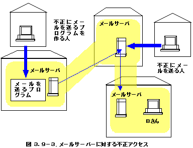 図3.9-3にはメールでの不正アクセスを示しました。メールサーバで説明しましたが、メールを転送するSMTPは単純に要求があった場合に、メールを送るため、メールサーバの存在を知っている人は、そのサーバを使ってメールを転送できることになります。以外かもしれませんがSMTPの転送にはIDやパスワードの認証がありません。単純に使われる場合は問題は少ないですが、大量にメールを送りこまれた場合は、複数の人が関係無いメールを受けるとともに、ネットワーク上に大量のメールが流れるため、ネットワーク全体の性能が低下するという問題も起きます。また、メールサーバ内部に大量メールの自動送信プログラムを入れられる場合もあります。
