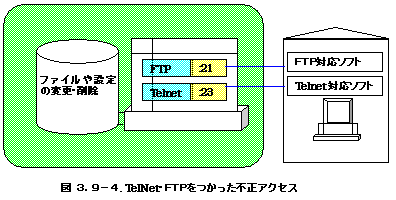 図3.9-4にはFTPやTelnetに進入された状態です。特にTelnetを使われると、ファイルや設定などの変更・削除などサーバを自由に操作されてしまいます。