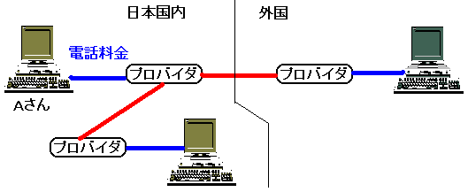 プロバイダ経由でインターネットを使用したインターネットフォーンやTV会議では、基本的に上図にに示したようにプロバイダ(個人と契約してインターネットの回線に接続するサービスを提供する会社)までの通信費用を払うだけで、国内や外国のどこでも同じ料金で通話/会議ができます。これはインターネット自体が複数の回線の集まりで上図のの赤い線で示したところはプロバイダ等が準備していて、この部分を使用するのはプロバイダとの契約費用に含まれているからです。 普通自分に近いプロバイダからアクセスするので、都度かかる費用は3分間10円になるでしょう。